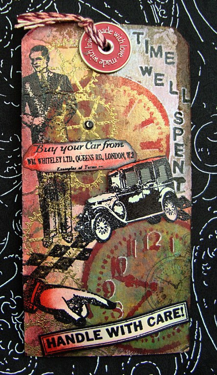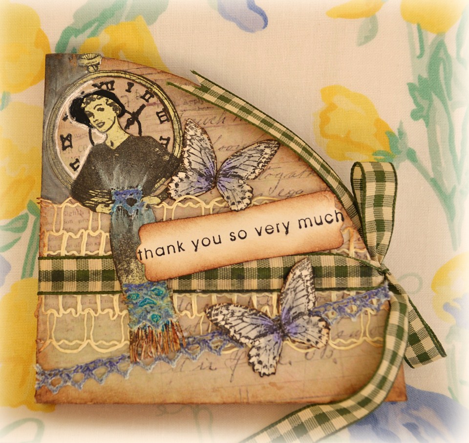 The stamped sentiments came from a Dyan Reaveley Quintessential Quotes set. Both ladies are from Flonzcrafts you can find one above and the other here . “Just A Note” is an Anita’s stamp from Docrafts, ladies face on the tag is a Creative Expressions stamp. The postcard with the flowers from Crafty Individuals was stamped onto a die cut envelope, added a tag inside and also one on the outside. In the right hand corner a PaperArtsy mini stamp was used called French Script.
